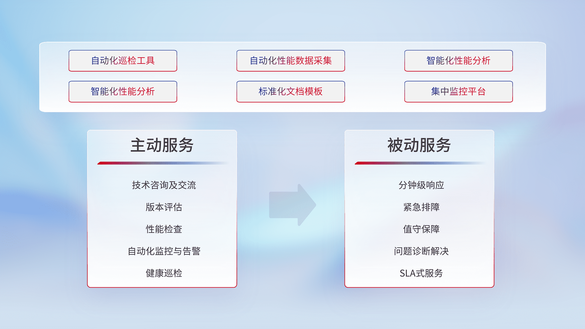 智能化工具和标准化文档,,,保障服务质量,,,提供主动服务(包含技术咨询、、版本评估、、、、性能检查、、、、自动化监控与告警、、健康巡检)和被动服务包含(分钟级响应、、、紧急排障、、、值守保障、、、、问题诊断解决、、、SLA服务)。。